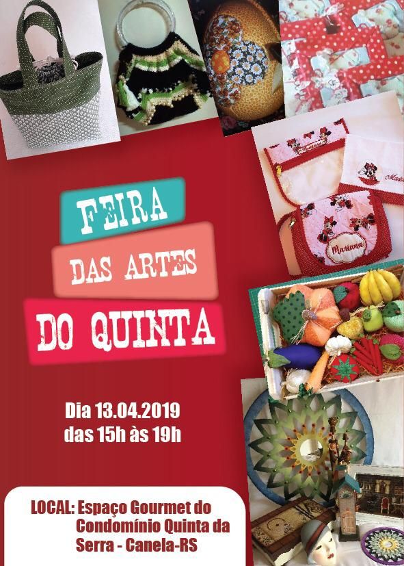 No dia 13/04 no Espaço Gourmet das 15h às 19h, realizaremos a terceira edição da FEIRA DAS ARTES DO QUINTA, e convidamos os moradores que quiserem expor seus produtos a participarem e prestigiarem o evento.